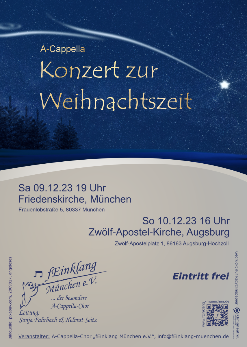 Zwölf-Apostel-Kirche Zwölf-Apostel-Platz 1, Augsburg (Hochzoll), Bayern, GermanyChoralmusik aus England, dem Baltikum und Russland Konzertbilld: Programm, u.a.: Beati Quaorum Via (Charles Villiers Stanford) O God Thou Art My God (Henry Purcell) Nolo Mortem Peccatoris (Thomas Morley) O God, Whose Nature and Property (Samuel Sebastian Wesley)
