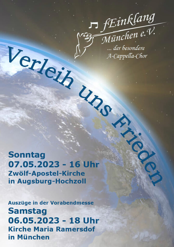 Programm, u.a.: Verleih uns Frieden (Felix Mendelssohn Bartholdy) Verleih uns Frieden (Heinrich Schütz) Verleih uns Frieden (Hugo Distler) Geistliches Lied (Johannes Brahms) Beim Konzert: Nach dem Konzert: